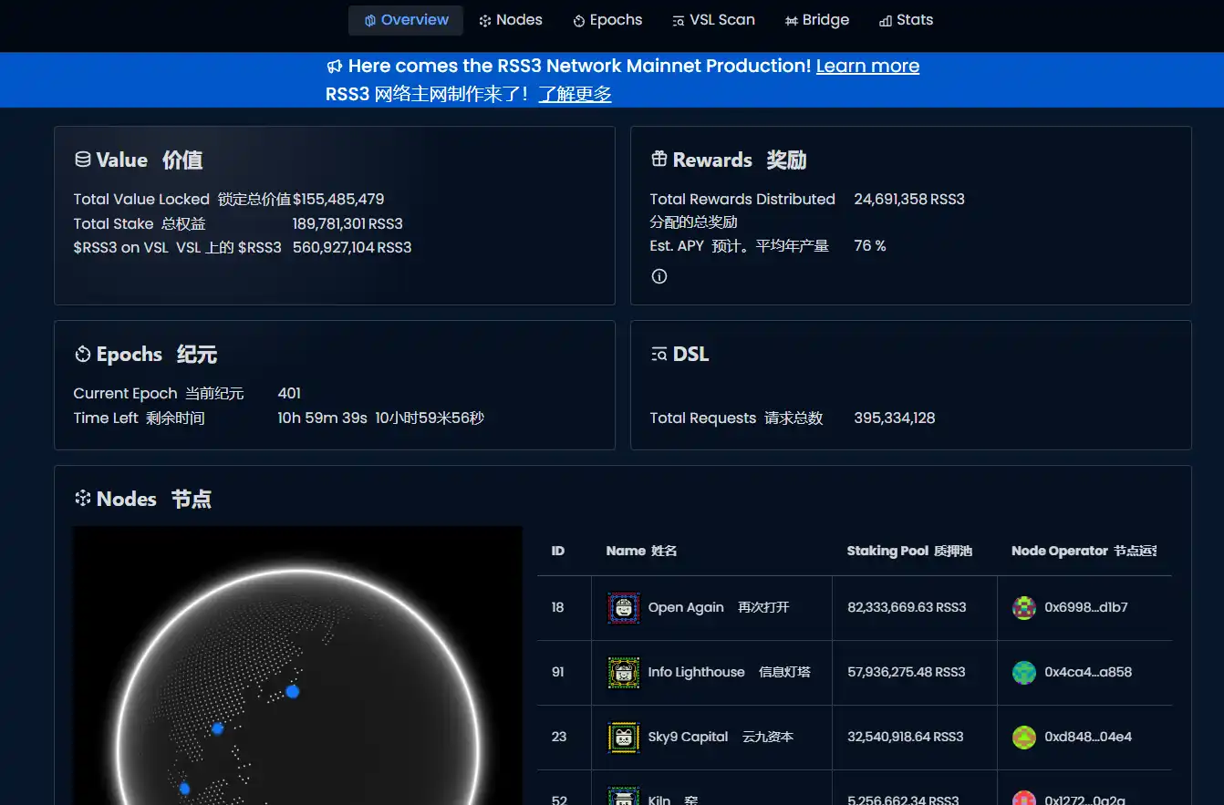 目前 RSS3 节点质押已开发数月,TVL 达$155,485,479. 平均年化达 76%!