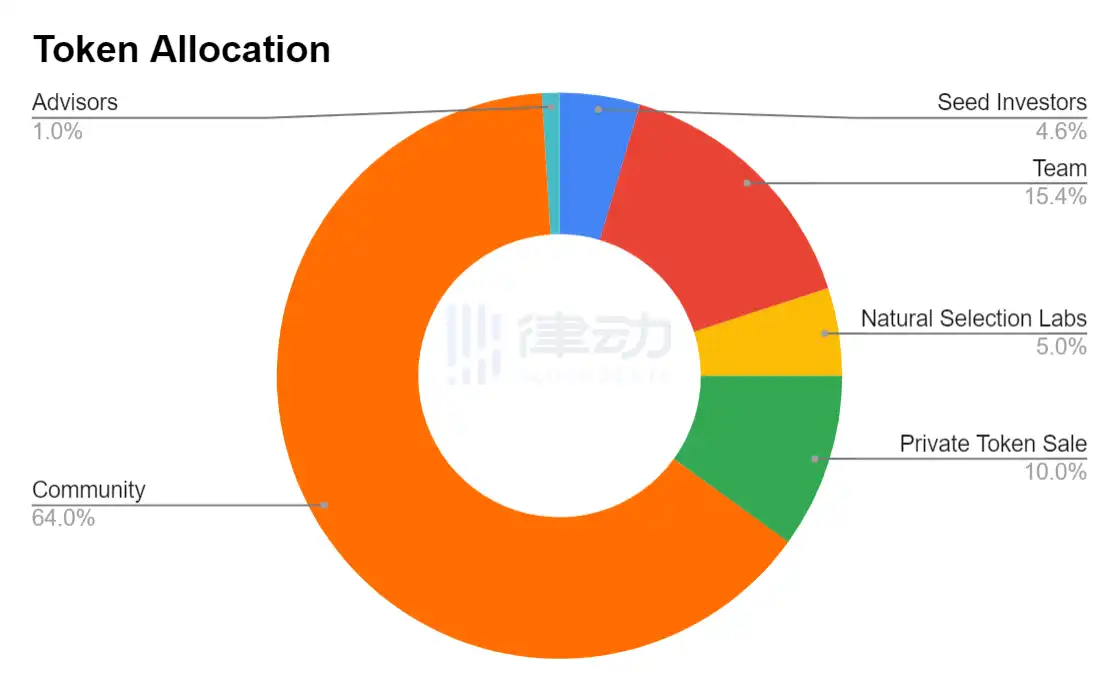 发行 Token 总量为 10 亿枚,其中 64% 将分配给社区,团队约分配 15%,种子及私募轮投资者约分配 15%,创始公司 Natural Selection Labs 分配 5%,项目顾问分配 1%。大部分 Token 将被长期锁定,并在 5 年内释放完毕。未来协议生态及金库的增长将来源于增值服务、SocialFi 活动及交易税收等多个方面。
