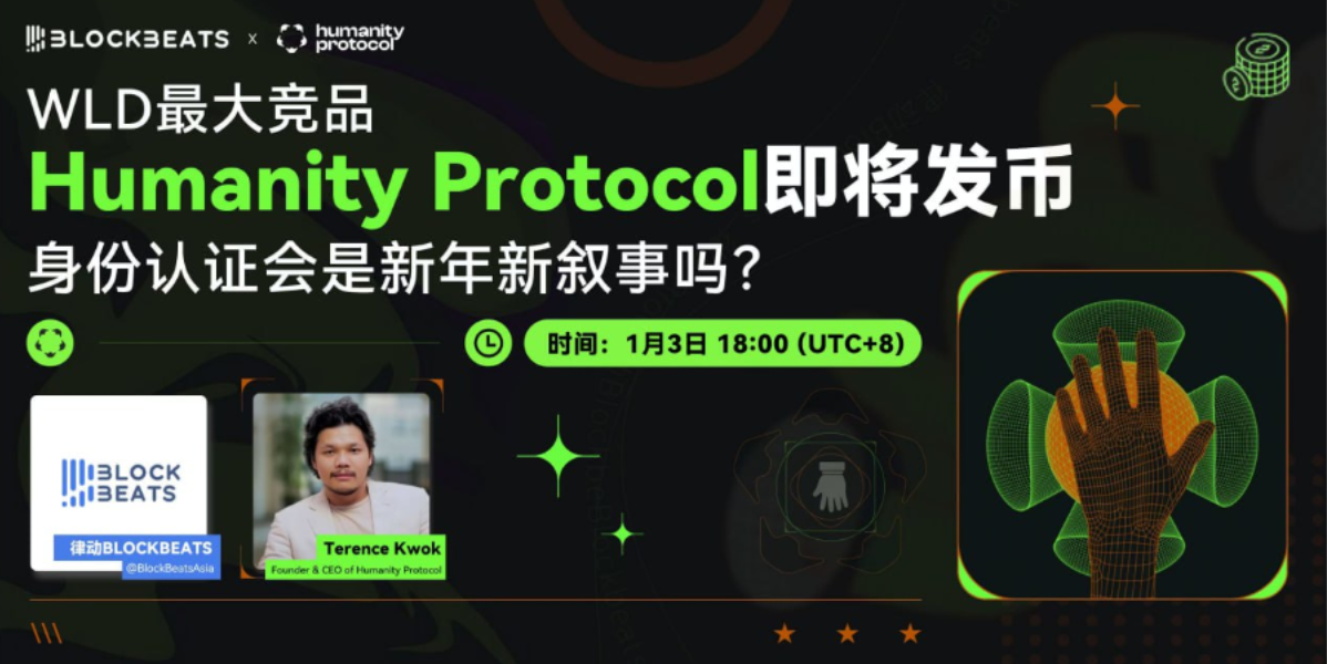 1 月 3 日, 邀请到 Humanity Protocol 创始人 Terence Kwok,以《Humanity Protocol 即将发币,身份认证会是新年新叙事吗?》为主题,聊聊 WLD 最大的竞品项目 Humanity Protocol 有哪些新机遇?