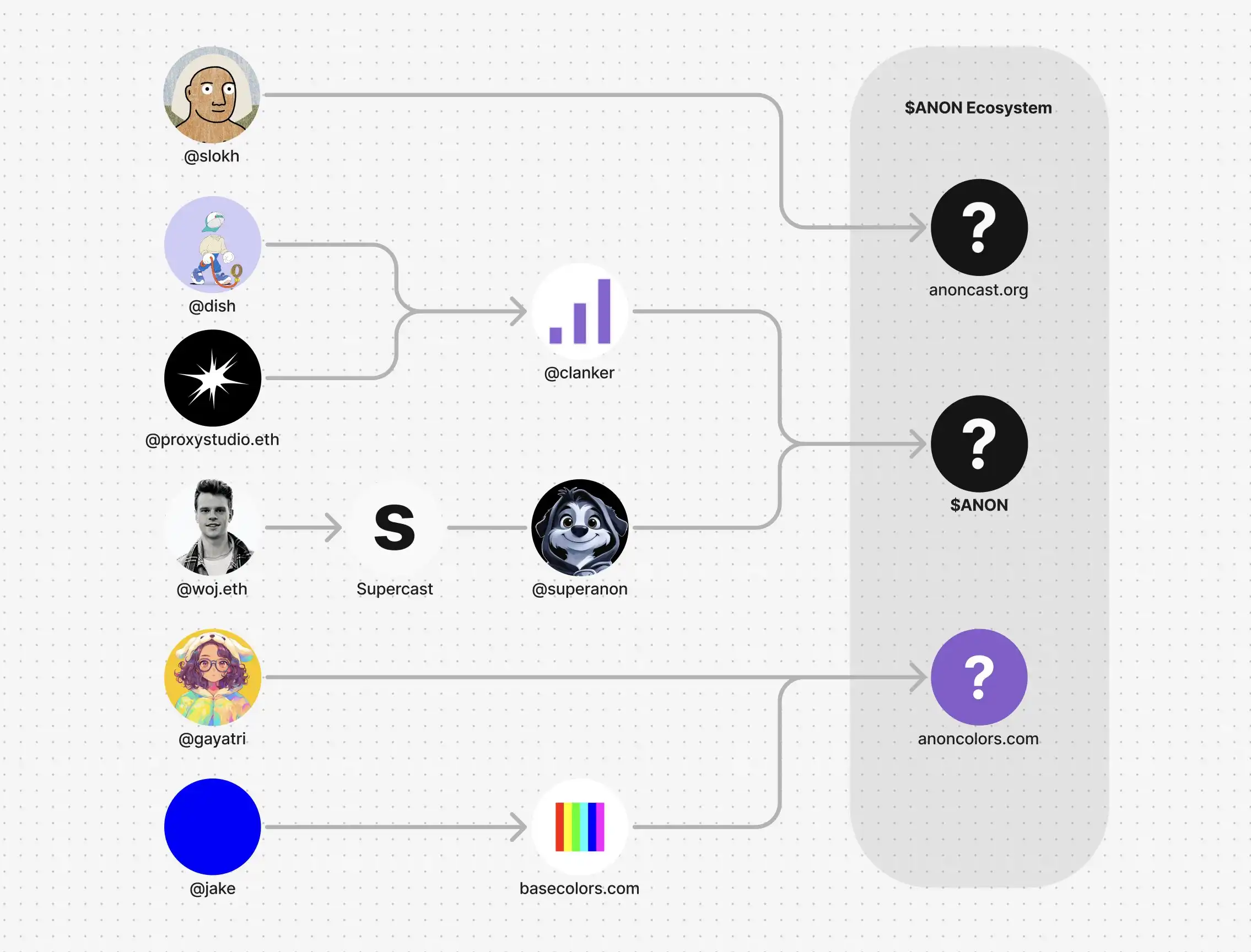 此后还有通过 @super 的匿名发帖账号 @superanon 联动 @clanker 发行了 memecoin $ANON。发行之后,不少用户给 @super 创始人 @woj 空投 $ANON,而 woj 又将获得的 $ANON 空投给 @super 用户,收获一波好评也提升了社区认可度。后续又有 builders 开始围绕 $ANON 构建应用生态,如基于 /basecolors 构建的带 $ANON 问号 logo 元素的颜色 NFT 项目 anoncolors.com,以及 @slokh 开发的需要验证 $ANON 持仓使用 zk 证明的匿名发帖项目 @anoncast,让 $ANON 拥有了实际应用场景。此后一些其他的匿名发帖账号如 rumourcast.xyz,33bits.xyz,66bits.xyz 也通过 Clanker 发行了相应的 memecoin。