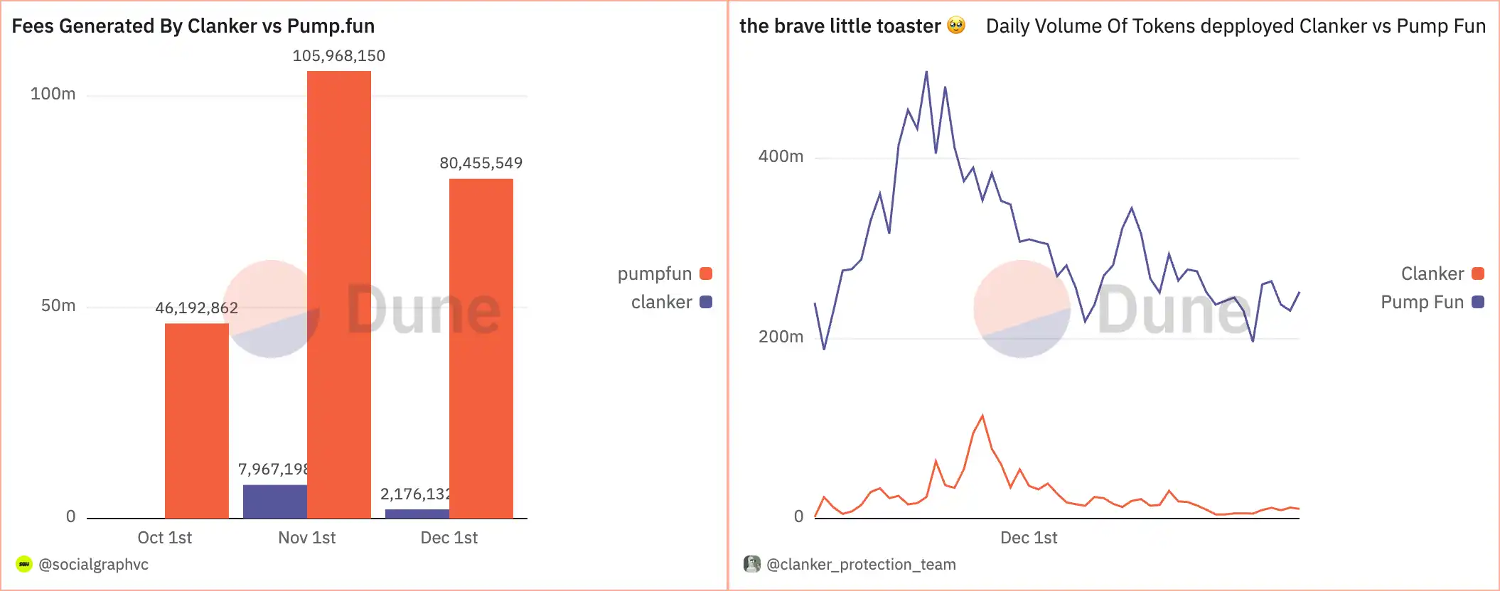 Clanker v.s. Pupm Fun https://dune.com/queries/4351277 https://dune.com/clanker_protection_team/clanker-vs-others