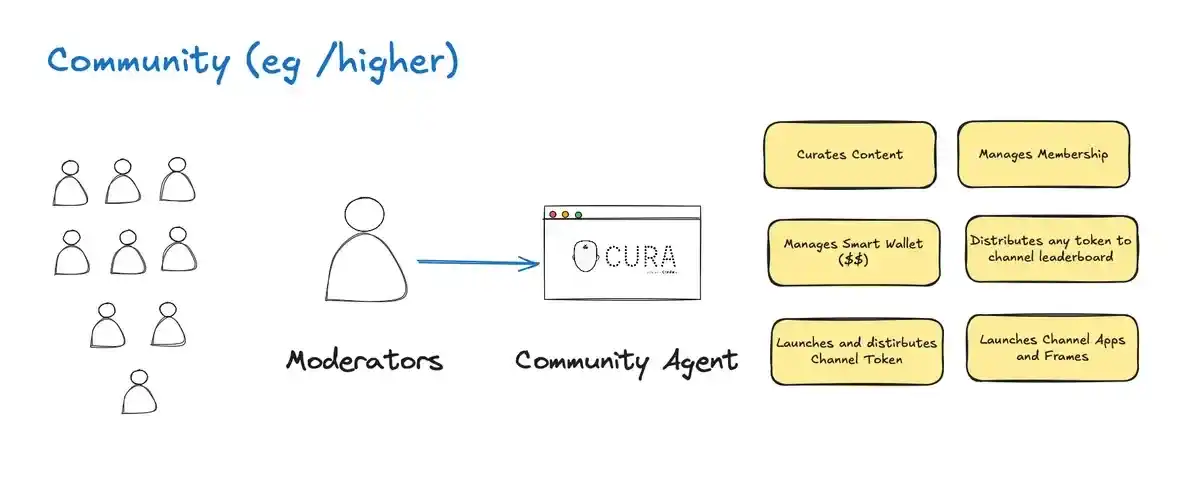 Cura 可以为每个 channel 提供一个基于 openrank 构建的 AI agent,用来控制成员和策展信息流,管理属于 channel 的钱包,推出 channel 的代币以及自动将奖励分配给排名靠前的贡献者,从而实现 channel 自动化会员管理、信息流展示和奖励分配。依靠 AI agent 进行 channels 进行内容治理和创作者激励的时代要到来了。