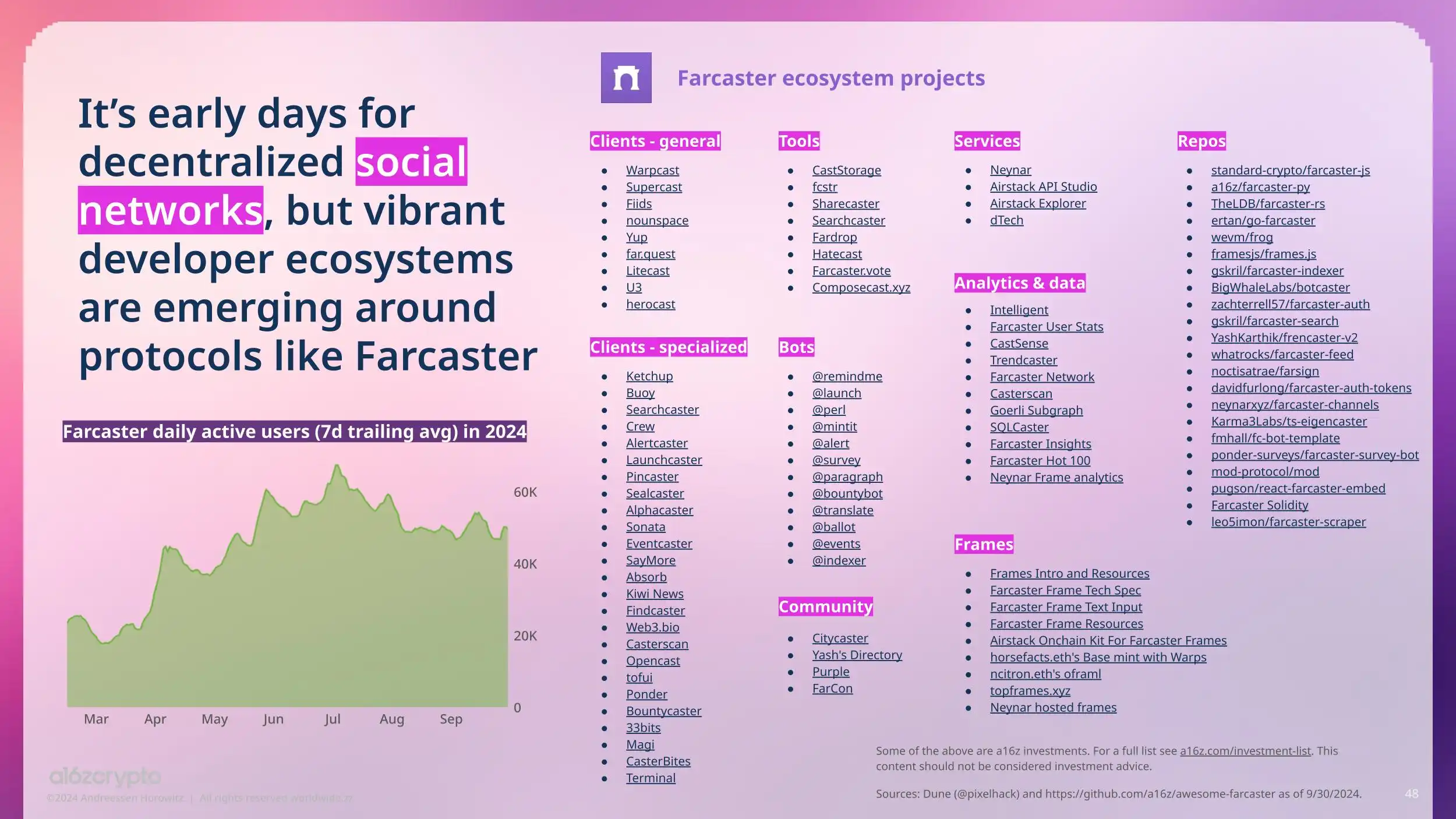 Farcaster ecosystem projects (by a16zcrypto, Oct. 16, 2024) https://a16zcrypto.com/posts/article/state-of-crypto-report-2024/