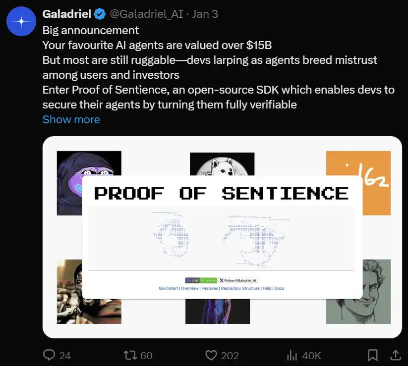 ·galadriel AI 推出了一个名为「Proof of Sentience」的 SDK,允许开发者在链上完全验证代理的存在。