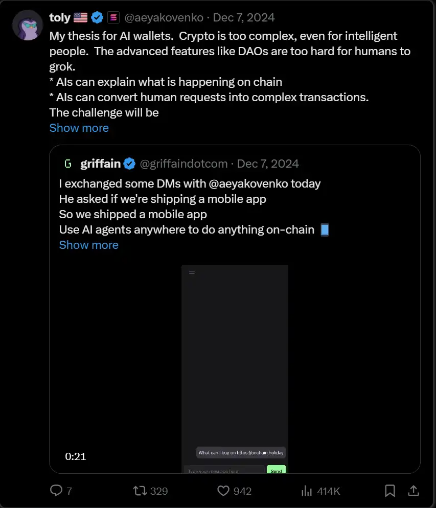我们首先在 DeFi 领域看到了这一趋势的出现,我们将看到更多的终端,允许人们通过自然语言或语音表达期望的结果,同时代理在幕后执行任务。现有的钱包和协议也将集成代理,以改善用户流程。