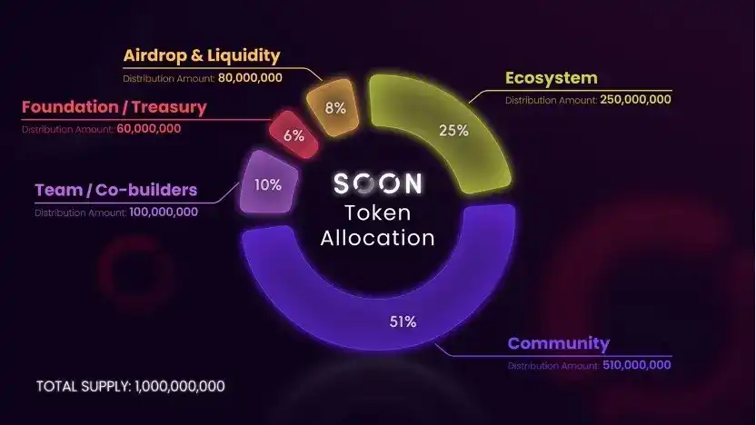 1 月 3 日,SOON 宣布 Alpha 主网现已上线,并公布 SOON 代币经济模型,SOON 初始总供应量为 10 亿枚(每年通货膨胀 3%),社区分配占比为 51%,通过公平启动进行分配。此外生态系统分配占比 25% 、空投和流动性分配占比 8% 、基金会 / 金库分配占比 6% 、团队和共建者分配占比 10%。