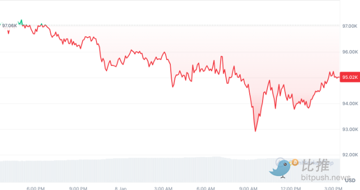 CMC 数据显示,过去 24 小时,BTC 一度跌至盘中低点 92,600 美元,截至发稿时回升至 94,400 美元附近,过去 24 小时内仍下跌 2.1%,以太坊下跌至 3,330 美元附近。