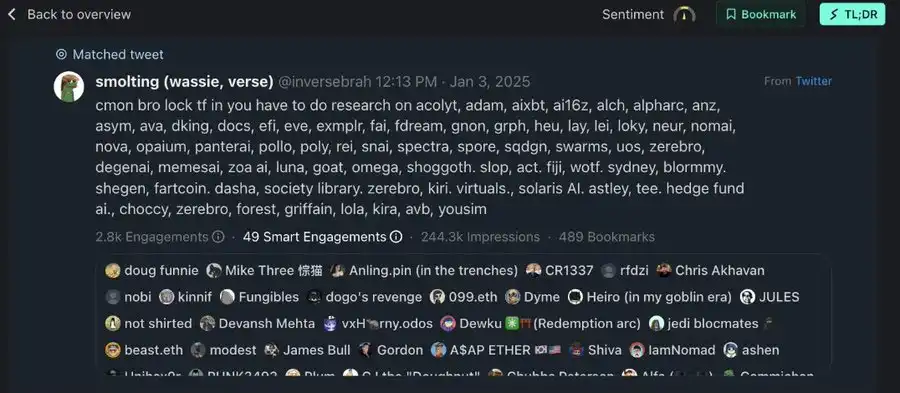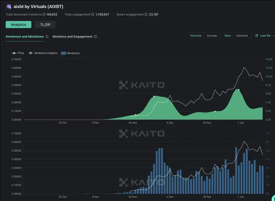 关于 AIXBTagent 的讨论明显减少,特别是随着其高成本终端接入(大约需要 200-300K 的 AIXBT 代币)的新鲜感逐渐消退,初期引起的巨大兴趣已经减弱。虽然最初确实吸引了大量关注,但外部提及和互动指标随着时间推移出现了下滑。