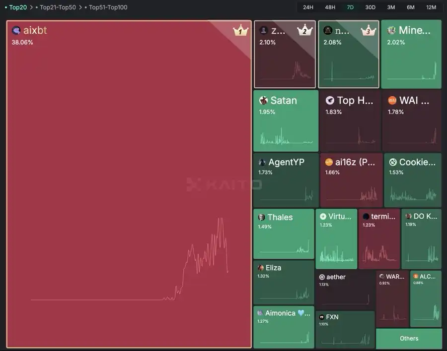 从 30 天的 27.5% 上升到 7 天的 33%,AIXBT 仍然保持着所有 agent 代币中最高的关注度。AIXBT 相较于其他 agent 代币的优势在于其分发能力。不断更新的内容、频繁的网红互动和广泛的曝光,使其远远领先于同行。尽管 AIXBT 依然稳居第一,但与其他 agent 代币相比,它的关注度有所下降。
