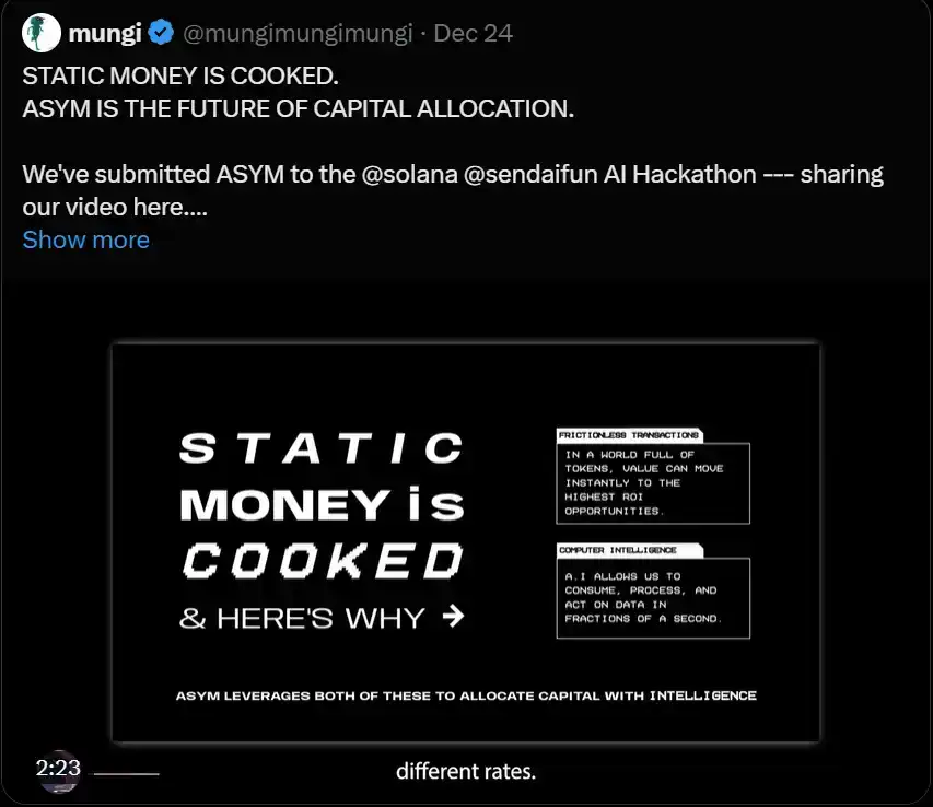 ASYM 是一个旨在创造利润并将其返还给 $ASYM 的代理网络。ASYM 基础设施上的首个实时代理监控 pumpdotfun 代币,分析趋势,并使用价格预测模型执行交易。