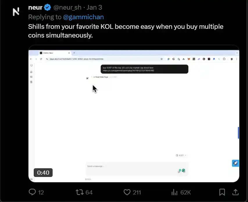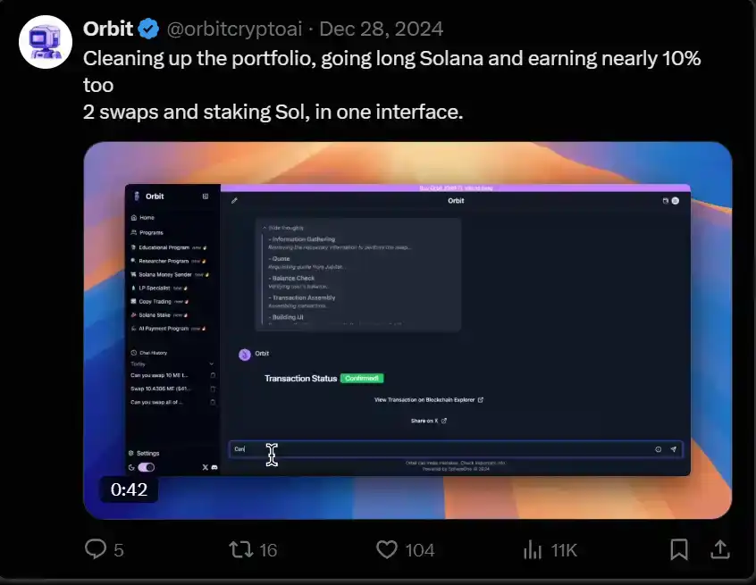 和 griffain 类似,都是 solana 链上的智能 AI 助手,可提供创建 / 检查 / 管理钱包、Swap/DCA/ 限价订单、交易 NFT、代币分析、热门代币、代币建议、创建和分享 Blink 发行代币等功能。Neur 是第三个推出代币的项目,但由于其开源的特点,迅速在估值上超越了 Orbit。Neur 将自己定位为 Solana 的副驾驶,专为 Solana 生态系统设计。Neur 由 sendaifun 的 Solana Agent Kit 提供支持。