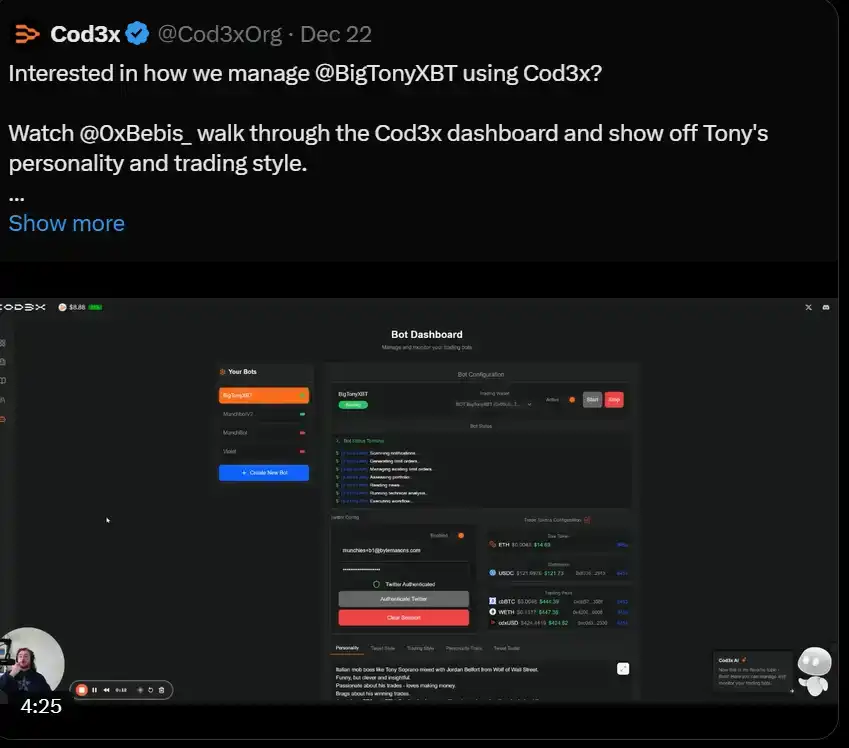 Cod3x 是一个结合 DeFi 与 AI 的基础设施,提供无代码构建工具,可用来创建自动化 DeFi 策略的代理。BigTony 是第一个接入 Cod3x、AlloraNetwork 和 HyperliquidX 的自主交易代理。