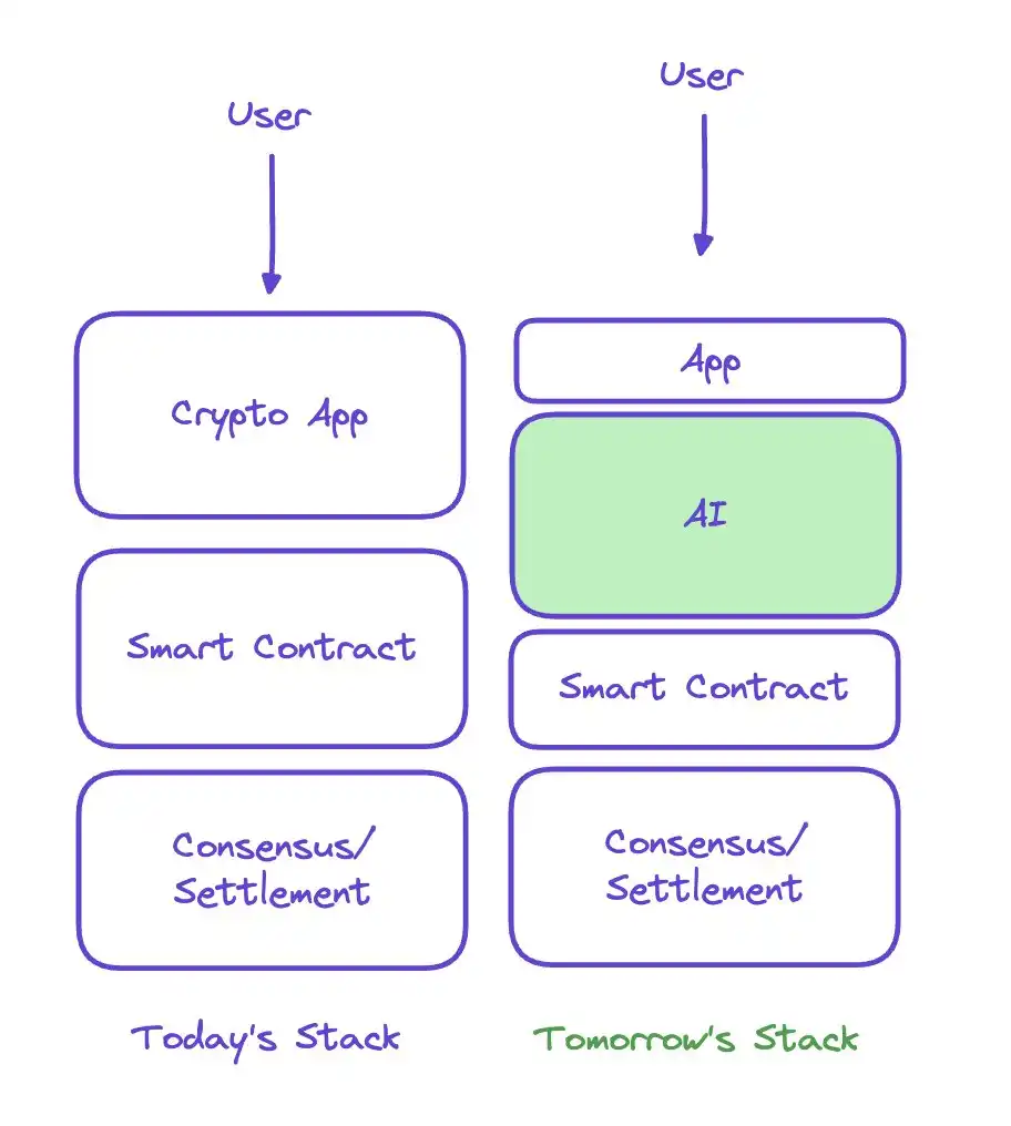 为实现这一点,AI 将成为应用层与加密基础设施之间的「连接组织」,在技术栈中向上与向下协同工作。未来,应用将直接与多个 AI 代理和模型交互,而这些 AI 代理将代表用户聚合并执行链上操作。智能合约也会演变为与 AI 原生结合的形式,例如「智能代币」,提供生成式和定制化的体验,而不是像今天这样千篇一律、确定性的模式。