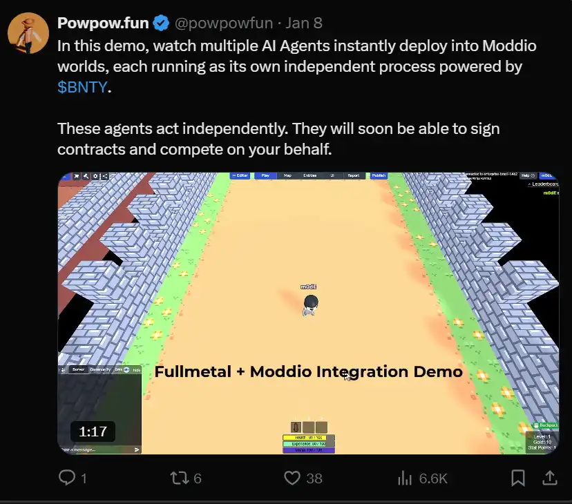 Indiedotfun 是应对这种短暂注意力的完美引擎。通过 moddio,轻量级独立游戏可以在几天内发布(而不是几个月),使创作者能够快速交付拥有动态 AI-NPC 的沉浸式世界。当玩家感到无聊时,可以从一款独立游戏跳到另一款,而创作者则改善他们的元宇宙体验,以留住玩家并维持游戏代币的价值。