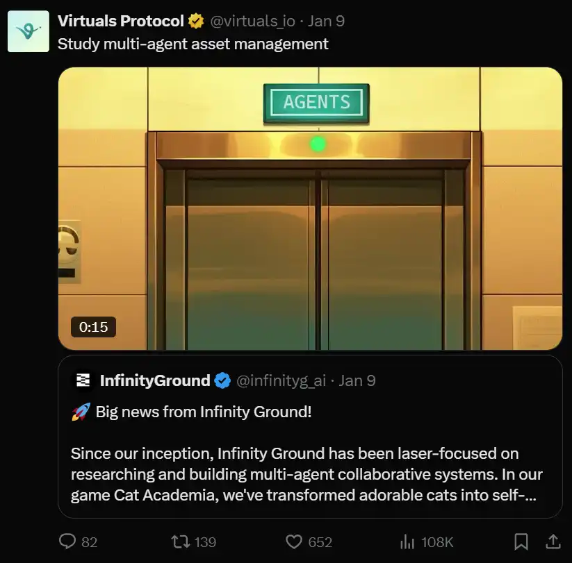 virtuals io 宣布与 infinityg ai 达成合作,推出多 agent 资产管理模式,并创立首家由 AI 运营的资产管理公司 Zenith XBT,为 agent 社会(agent 间交互)奠定基础。