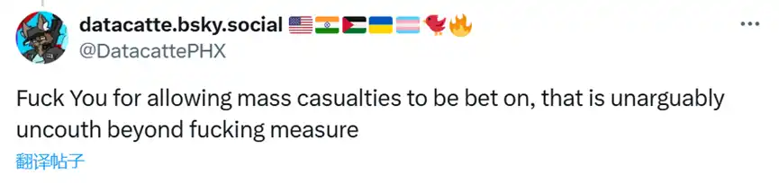 然而,许多网友对这些市场及 Polymarket 的宣传并不买账。一位 X 平台用户直言:「拿野火开赌实在是病态。」另一位用户表示,对这种悲剧进行投注「无论如何都是令人难以接受的无耻行为。」