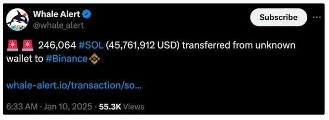 存款阈值设置是因为基于一个交易所数据分析。具体来说,以 Whale Alert 对 BTC、ETH 和 SOL 巨鲸分别设置的 5000 万美元、 5000 万美元和 2000 万美元的限额为基准,我们将存款阈值对应分别下调至 2000 万美元、 2000 万美元、 800 万美元,这与币安是全球现货交易量的 40% 份额相匹配。
