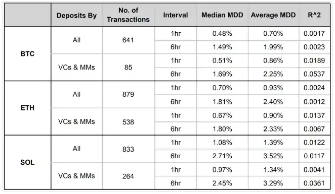 · 根据回归分析,大额交易存款与随后的价格变化之间的 R 平方值较低(从 0.0017 到 0.0537 不等)。将数据缩小到来自 VC 和 MM(做市商)的存款后略微提高了 R 平方值,但将它们作为交易信号的实际效用仍然有限。研究结果强烈表明,巨鲸向交易所存款缺乏作为可靠交易信号的预测能力。