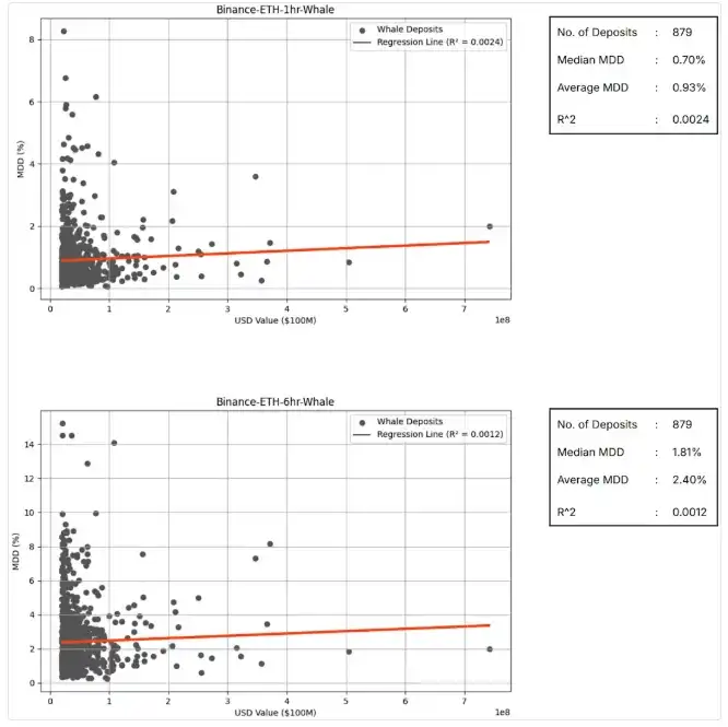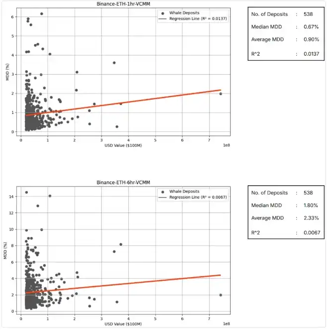 · 在链上确认大于阈值的存款后,抛售压力会在特定时间范围内显现。我们分析了两个时间段:一小时和六小时。