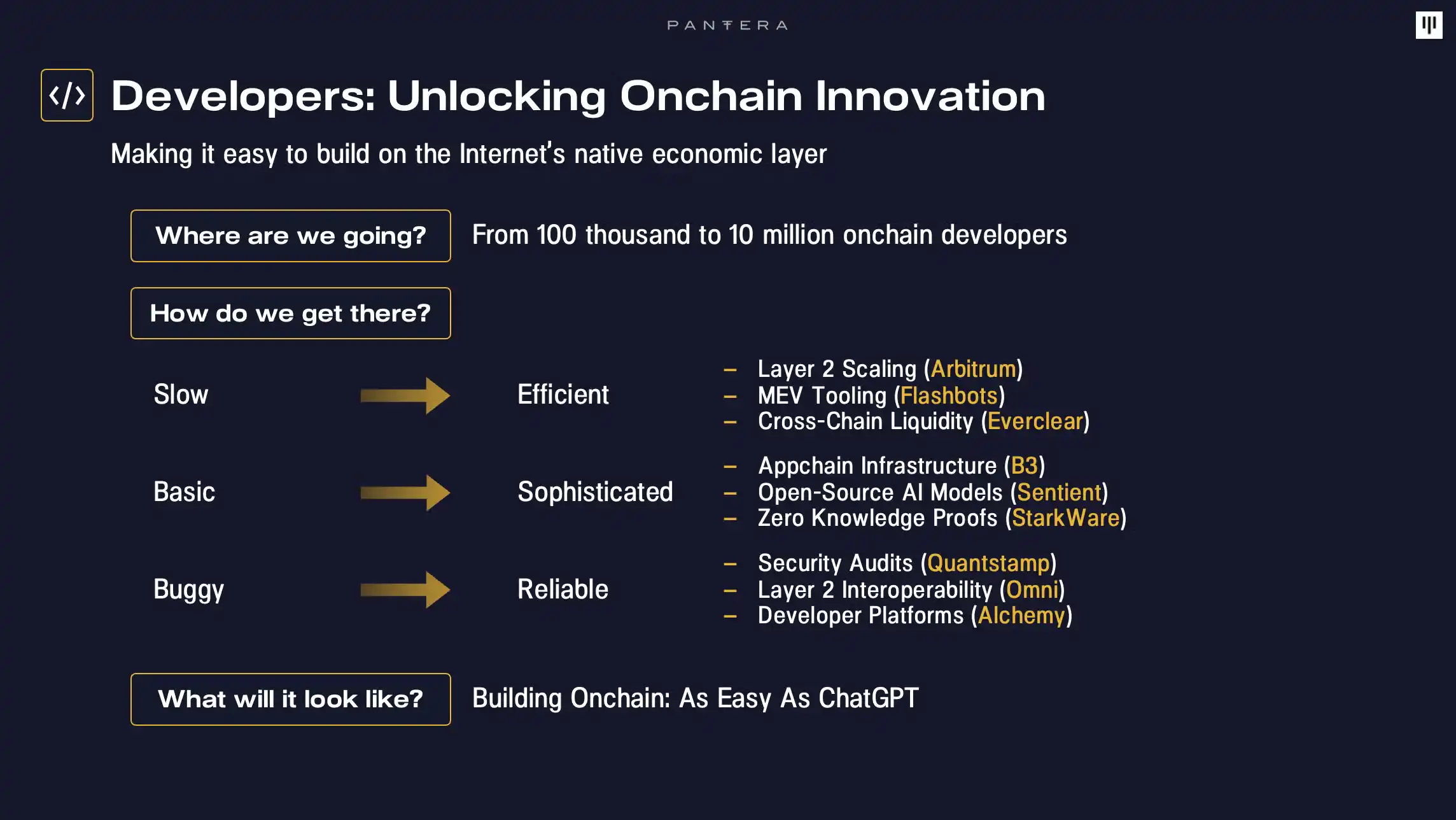 目前约有 10 万名开发者在区块链上进行开发,仅相当于硅谷某个科技巨头的一半。要实现主流普及,我们需要将这个数字扩大 100 倍,将 1000 万名开发者引入区块链生态。