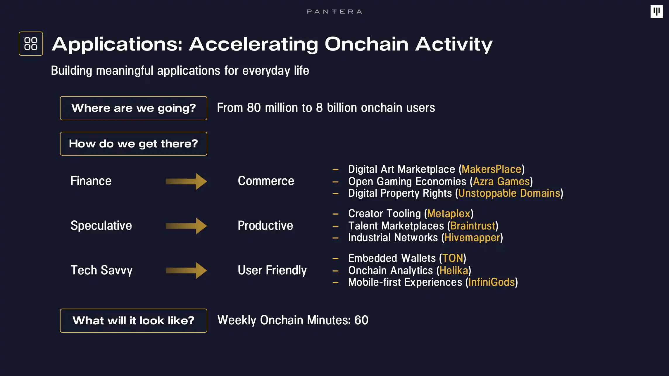 据大多数估算,现有链上用户约为 8000 万。大部分增长源自加密货币作为「华尔街 2.0」的吸引力——一个全新的资本募集、投机和转账场所。但要实现 100 倍增长,覆盖 80 亿人,关键在于从「华尔街」转向「主街」。