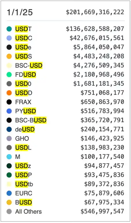 前 20 个法定货币支持的稳定币中,有 16 个在其名称中包含「USD」。