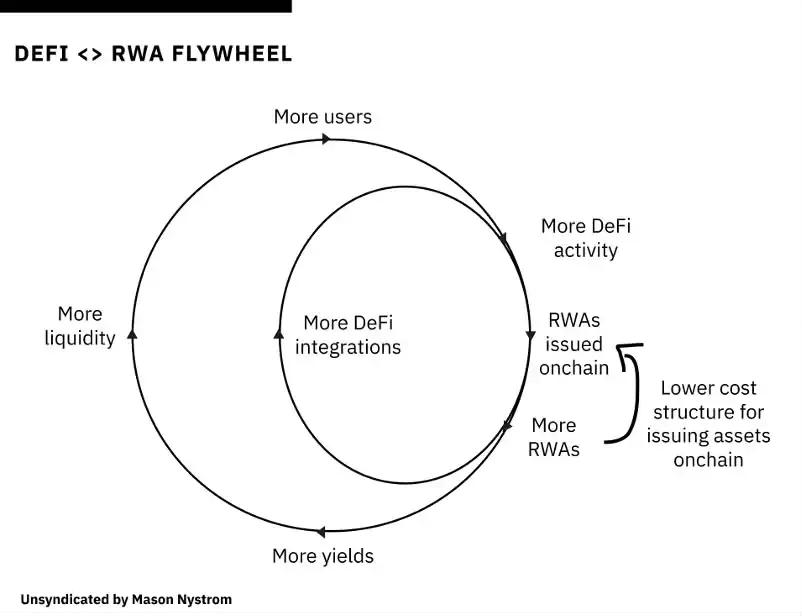 随着更多传统资产转向链上,这将触发一个复合飞轮效应,逐步将传统金融体系与 DeFi 协议融合,甚至取而代之。