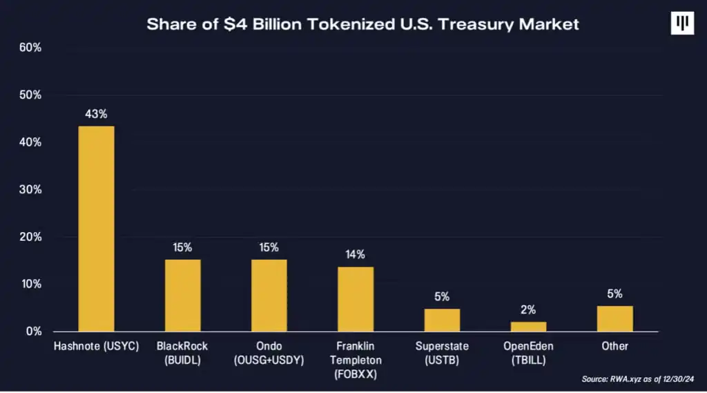 根据美国财政部的数据,1200 亿美元的稳定币担保品直接投资于美国国债,促进了对短期证券的需求增加。[3] 除了稳定币,直接代币化美国国债也是一个增长趋势。像 BlackRock 通过 Securitize、富兰克林·坦普尔顿(Franklin Templeton)、Hashnote 和 Pantera 投资组合公司 Ondo 等公司正在领导这一价值 40 亿美元的市场。