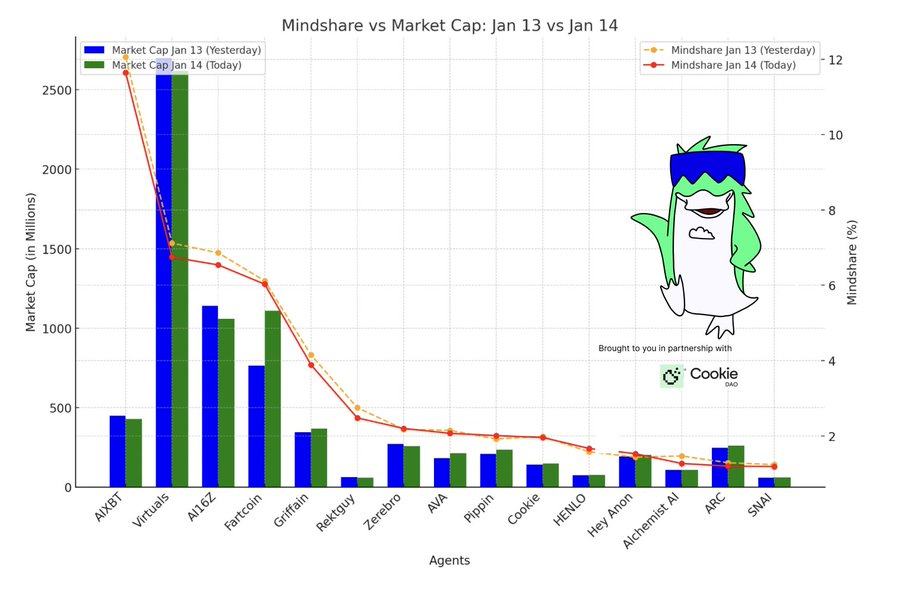 原文标题:AI Agent Analysis: Mindshare vs Market Cap (January 14th, 2025)