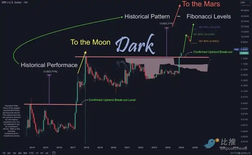 该分析师认为,根据 2017 年涨幅的斐波那契回撤水平,XRP 价格在短期内可能上涨至 10.23 美元甚至 18.23 美元,无论是「登月」还是「登火星」,这两个目标值在 2025 年都有可能实现。
