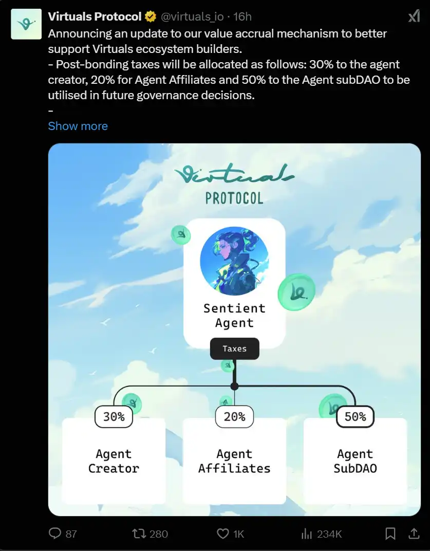 自 2024 年 10 月以来,12,990,427.85 的 VIRTUAL 交易收入已被积累,用于回购和销毁代币。