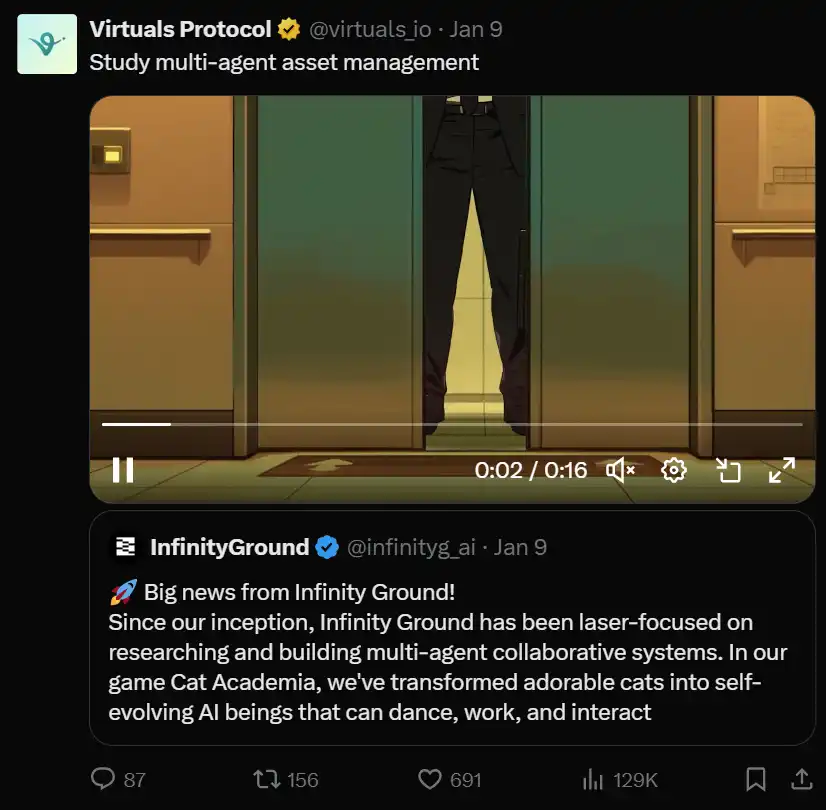 代理之间的协作也在加速发展。Virtuals 最近与 infinityg ai 合作,开发多代理协作系统(代理商业模式)。