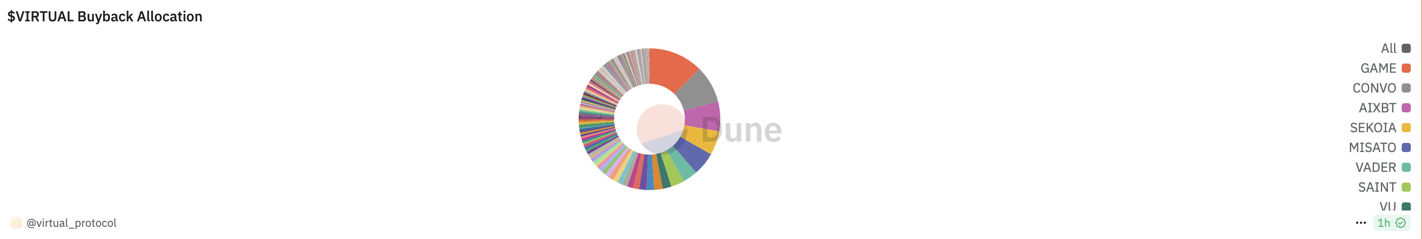 今晨,Virtuals 发布公告称将要把通过后期质押(post-bonding)交易收入累计获得的 12,990,427.85 枚 $VIRTUAL 用于在未来 30 天内基于时间加权平均价格(TWAP)回购并销毁生态内相关代理代币。回购数量排在前列的 GAME、CANVO、AIXBT 等代币均有超过 20% 涨幅。