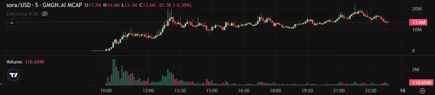 Sora 代币一经发射,2 小时内市值速通 19M,24H 交易量高达 75M,随后市值一直在 10M 之上波动。
