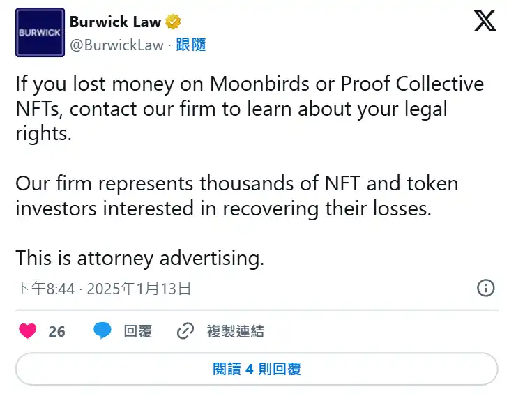 Burwick Law 特别声明,律所与任何使用其名称或形象的代币无关,并强调其致力于推动加密产业的问责机制。除了 Pump.fun 案件外,律所也针对其他涉及诈欺的 NFT 和区块链项目提起法律诉讼,包括 Moonbirds 和 Proof Collective NFT,以及 Full Send Metacard NFT。