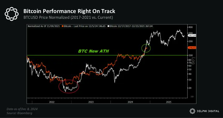 Delphi Digital 的周期模型曾预测比特币将在 2024 年第四季度创下新高。目前比特币走势与预测一致。