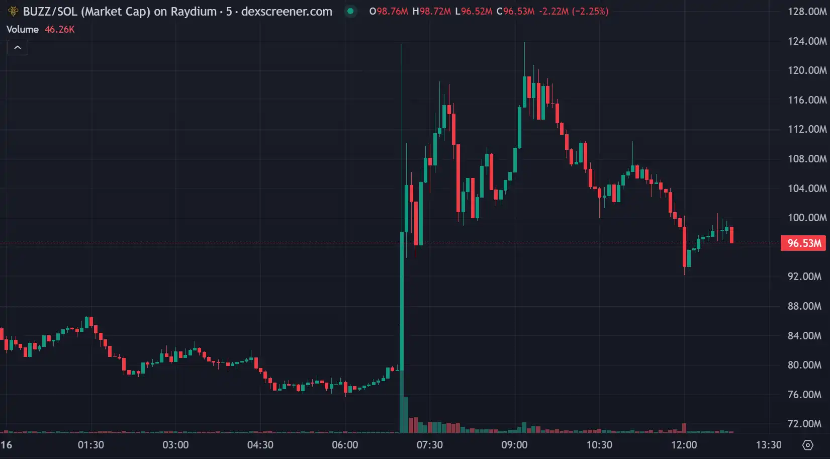 在 Solana AI 黑客松 BUZZ 成功夺冠结果公布后,根据 BUZZ 代币的 24 小时交易数据显示,今日涨幅最高达 61.44%,市值一度触及 1.22 亿美元,虽未突破前高,但表现仍备受瞩目。目前交易量为 4150 万美元,市值回落至 9653 万美元,整体呈现波动状态,市场情绪持续升温。