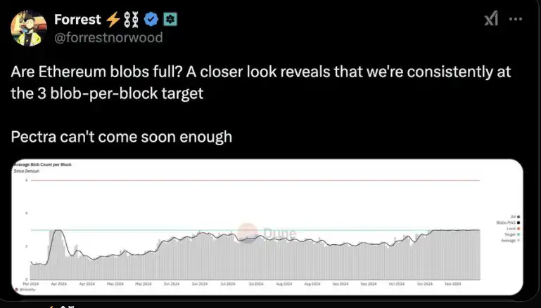 核心开发者知道这是关键问题。VitalikButerin 说将 Blob 数量从 3 增加到 6,比所有其他 Pectra 升级加起来都重要。但将容量翻倍只会给我们延长几个月,而不是几年。