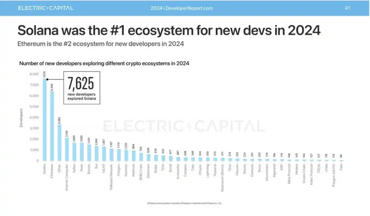 Lily:从任何一个指标来看,2024 年我们的生态都实现了显著增长。不管是交易量、用户量还是资金量等方面,都呈现出强劲的上升趋势。去年大概 9 月还是 10 月,我们在一些关键指标上超过了以太坊。一个是区块链本身的经济价值捕获(economic value capture),我们在 10 月就超越了以太坊。另外,如果看应用层的收入,我们也超越了以太坊。还有,根据最近的开发者报告,在过去大概 6 年,每年会出一个对各地区开发者数量详细统计的报告。从去年 7 月开始,增长最快的是我们的开发者社区。