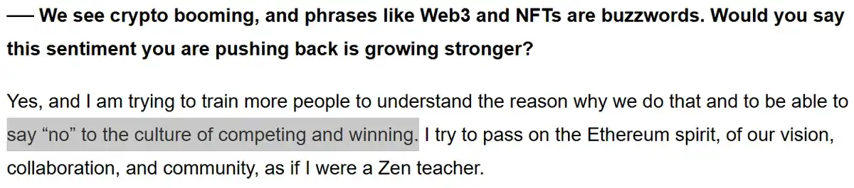 哦对了,EF 似乎也不在乎竞争——今日以太坊社区扒出了 Aya Miyaguchi 此前在接受采访时说过的话:「我正在训练人们对竞争和获胜的文化说不。」