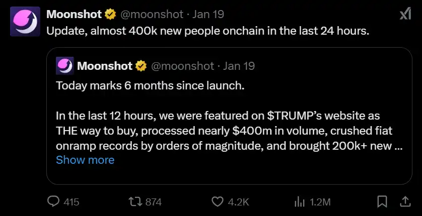 在西方:Moonshot 被大量用户涌入 Solana 所淹没,登上了应用排行榜的顶部,这一模式让人想起上个周期,当时 Moonpay 看到了大量美元法币存款通过 ETH 的入口直接流入 OpenSea。