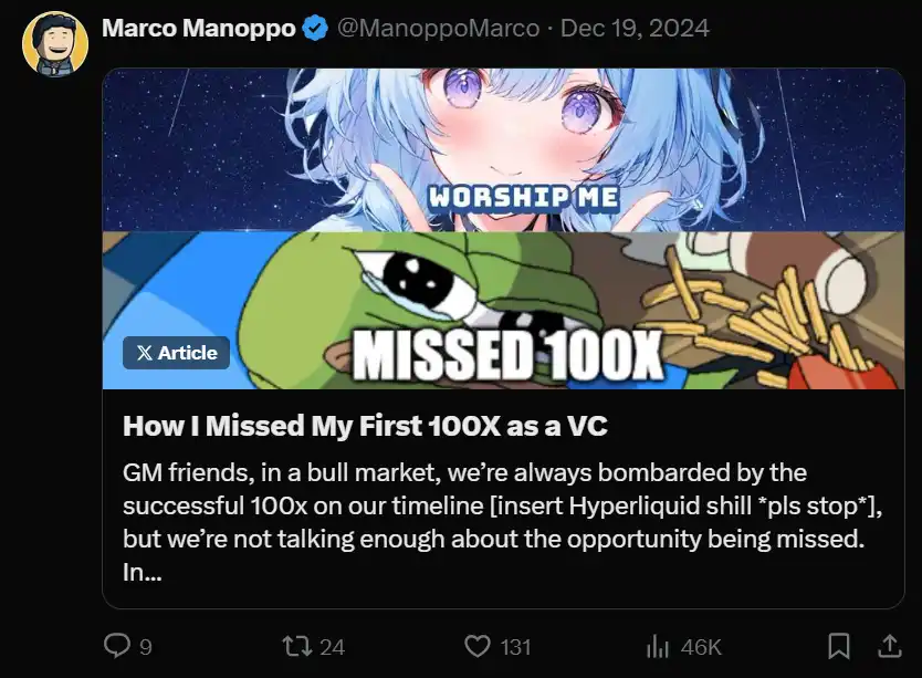 从长远来看,市场将会提供下一个 100 倍的机会,迎合你的优势,只要你不断积累。这也是我在面对 ManoppoMarco 作为加密投资者的第一次 100 倍错失时,给出的建议。