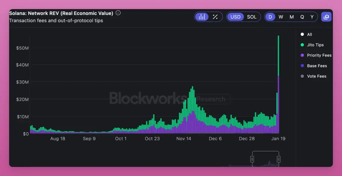 高手续费为 SOL 的质押者带来了收益,总手续费收入达到 5700 万美元。其中,优先手续费 (Priority Fees) 占 3300 万美元,Jito Tips 占 2350 万美元。