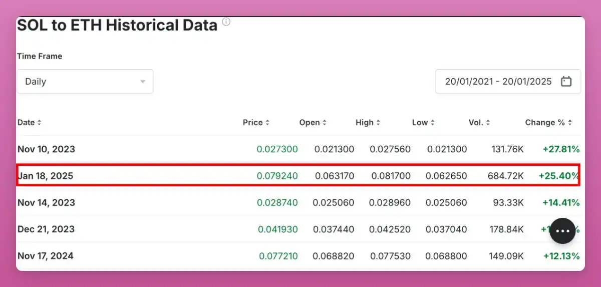 $TRUMP 代币上线当天,SOL 对 $ETH 的汇率出现自 2021 年以来的最大单日涨幅,高达 25%。