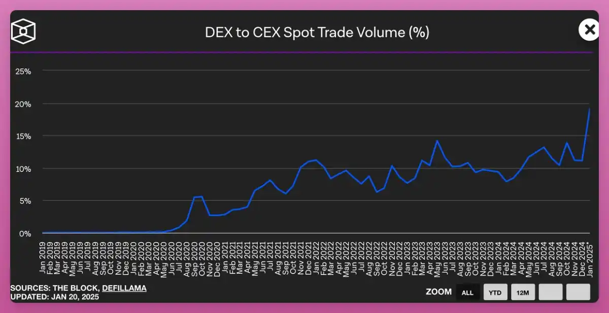 由于这一现象,DEX 与中心化交易所 (CEX) 的交易量比例达到了 19% 的历史最高点。