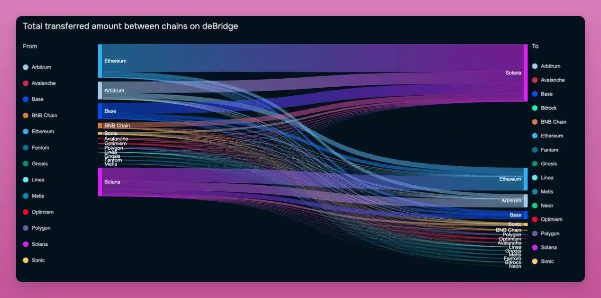 根据 DeBridge 的数据分析,Solana 在一周内的资金流入达到约 3 亿美元,主要来自 Ethereum、Base 和 Arbitrum。
