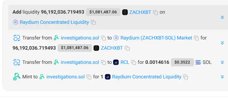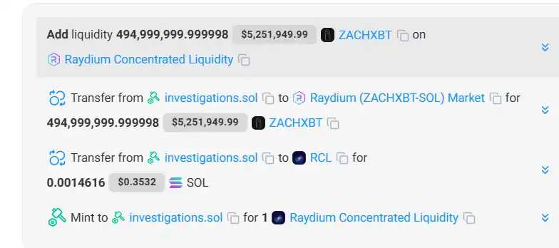 ZachXBT 将他的空投代币添加到 Raydium 上的单边流动性池中。该代币的市值在两小时内从 500 万美元飙升至 8000 万美元。