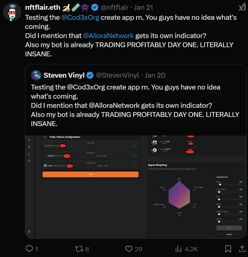 Big Tony 本人已经用技术分析和 AlloraNetwork 的机器学习价格预测模型进行交易数月。他的钱包是公开的,任何人都可以验证他的收益。Cod3x 正在招募第一批用户来启动 agent——你需要一千万美元 TONY 才能加入。