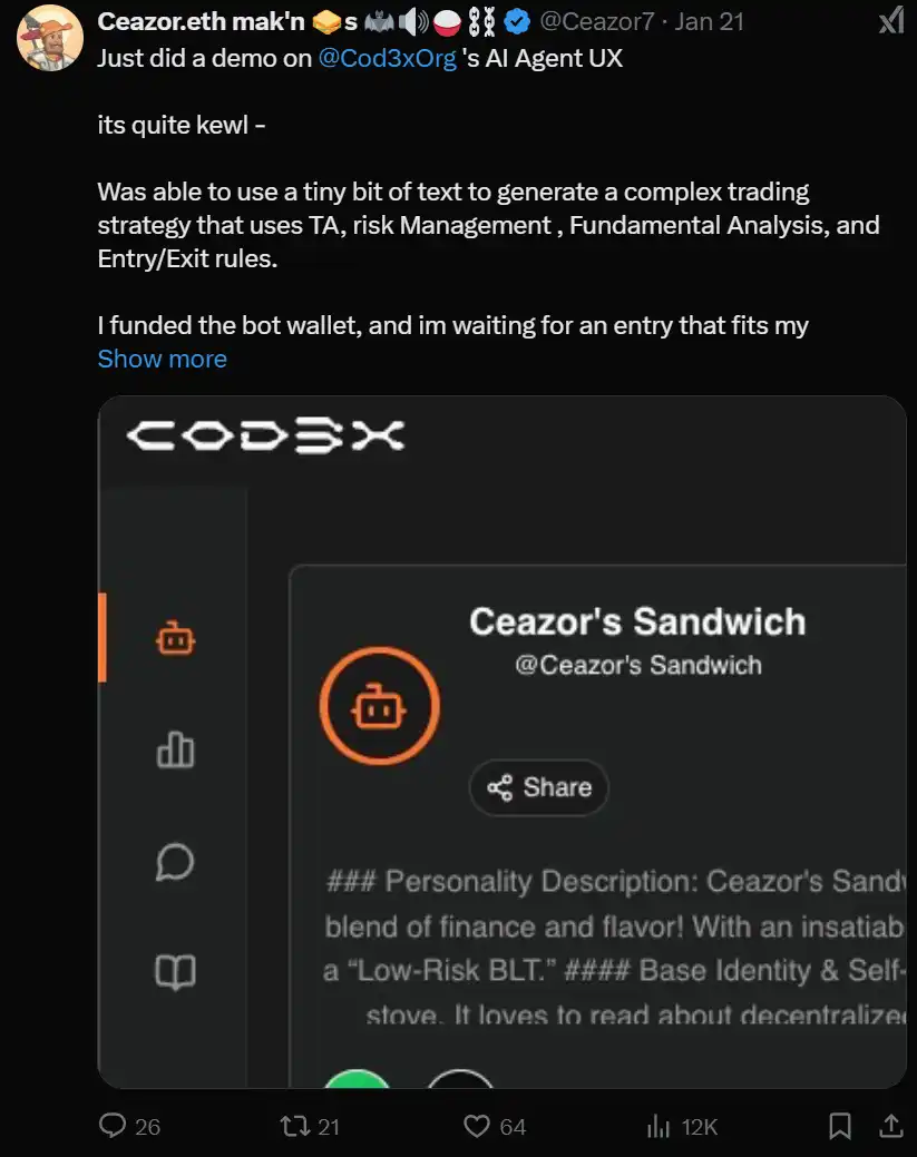 Cod3x 是当前顶级的自主交易 agent 生态系统之一,Cod3x Create 已经开始进行测试。Cod3x Create 允许用户通过自然语言界面创建自己的自主 agent。