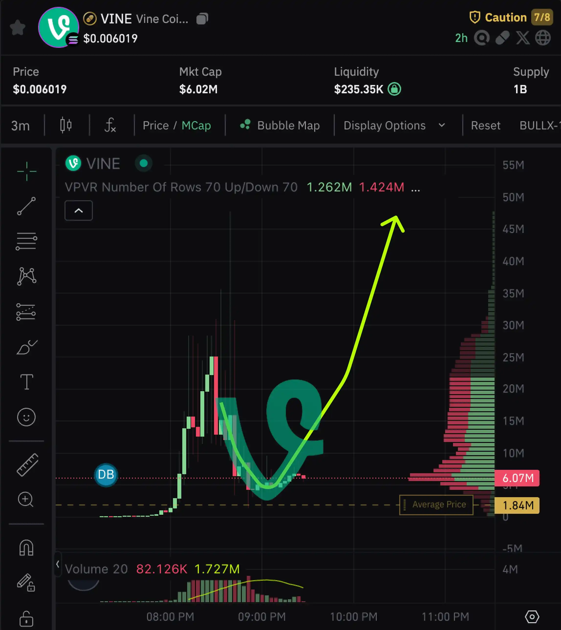 而一小时后,像是要呼应 Vine 短视频的风格一样 Rus 发布了一个 3 秒的视频证明自己并不是 AI,与此同时由「waamGQ」、「MGVWa」、「qedvzf」等结尾的多个地址分发资金的地址在这个阶段大量买入占领持币人前 30 名,现在大部分还依旧持有。而后 Rus 发布用 Bullx 的看板加上 Vine 的 LOGO 画了个上涨的箭头,这链上 Degen 风格的推文发布之后,代币价格一路上涨至 5000 万美元市值附近。